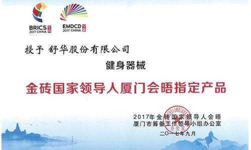 2017年,球客岛健身器材入驻厦门金砖国家领导人会晤,并成为厦门金砖会晤指定健身器械。X6豪华智能家用跑步机荣获中国好设计金奖。 2017, Shuhua fitenss equipment presented itself in Xiamen as the designated fitness equipmentof Xiamen BRICS summit. X6 luxurious home use treadmill won gold award of China Good Design.